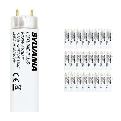 I Confezione Multipack 25x Sylvania Luxline Plus T8 18W - 830 Luce Calda | 60cm sono i tubi più comuni e tra le lampade più vendute nel mondo. Questi tubi T8 (TL-D per Philips) hanno una lunghezza la quale corrisponde alla potenza di 18W.