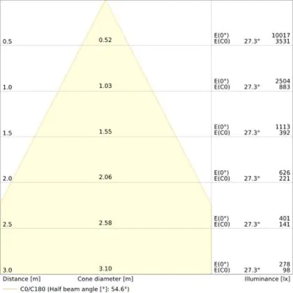 Il codice colore è una combinazione di resa cromatica (CRI) e colore della luce (Kelvin). La prima cifra indica la resa cromatica (1 = resa del colore molto bassa, 9 = massima resa del colore), mentre la seconda e la terza si riferiscono al colore della luce. Esempio: il codice colore 830 indica una buona resa cromatica (8) e luce bianca calda (3000K). |
