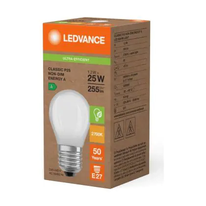 Grazie al suo consumo di soli 1.2W e la sua lunga durata di 50000 ore, puoi risparmiare fino al 60% di energia e con costi di manutenzione abbattuti. Le tradizionali lampadine a incandescenza durano solamente 1000 ore. Installare la lampadina LED è veramente facile, basta svitare la vecchia lampadina E27 ( una volta fredda ) e avvitare successivamente la nuova lampada di Ledvance con forma Pera nel portalampade. Questo prodotto di Ledvance è di qualità professionale.