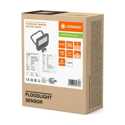 Descrizione Ledvance Proiettore LED Aluminium Nero 8W 1200lm 100D - 840 Bianco Freddo | IP65 - Sensore Di Movimento E Luce - Simmetrico