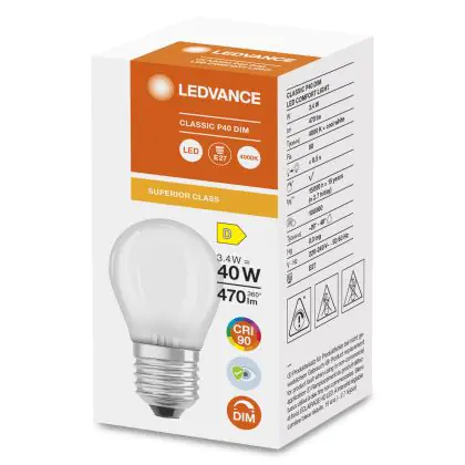 La Ledvance Superior Classic LED E27 Sferica Ghiaccio 3.4W 470lm - 940 Bianco Freddo | Dimmerabile - Miglior resa cromatica è la perfetta sostituzione per la tua lampada convenzionale 40W con attacco E27 grazie alla sua tecnologia LED. Passare a LED ti offrirà tanti vantaggi!