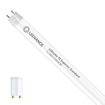 Il Ledvance Tubo LED T8 Superior (EM/Mains) Standard Output 5.1W 810lm - 830 Luce Calda | 44cm - Sostitutiva 15W è l’alternativa perfetta per il tubo fluorescente standard 15W nelle plafoniere con un reattore. Con questo tubo LED hai una garanzia di una vita media utile molto lunga e 5 anni Lampadadiretta.it di totale garanzia. .