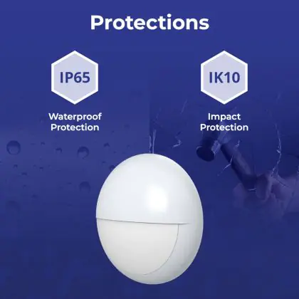 Un elemento importante delle plafoniere e delle applique LED è il loro livello di proezione IP, che indica la protezione contro l'ingresso di polvere e umidità/acqua. A partire da IP65, un apparecchio di illuminazione è a prova di polvere e acqua. Il valore IP di questa plafoniera LED è: IP65. Stai cercando una plafoniera LED per esterni? Allora presta attenzione alla protezione da urti e impatti, ovvero il valore IK, che per questa lampada è IK10 - 20 Joule.