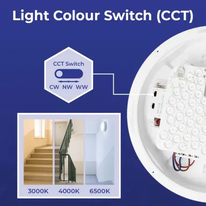 Per scegliere un apparecchio di illuminazione bisogna anche considerare dove verrà installato. Per esempio la luce di 2700 Kelvin (bianco molto caldo) e 3000 Kelvin (bianco caldo) creano un’atmosfera rilassante e piacevole. Questa tonalità è quindi molto adatta ad ambienti accoglienti o a zone generiche come corridoi, ascensori, disimpegni o pianerottoli. Una luce di 4000 Kelvin (bianco freddo), invece,è più luminosa e fresca ed è quindi adatta come illuminazione funzionale in uffici, aziende, scuole e biblioteche. La temperatura di colore di questa plafoniera LED è 3000K - 4000K - 6000K CCT.