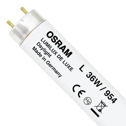 I Osram Lumilux De Luxe T8 36W - 954 Bianco Freddo | 120cm sono i tubi più comuni e tra le lampade più vendute nel mondo. Questi tubi T8 (TL-D per Philips) hanno una lunghezza la quale corrisponde alla potenza di 36W.