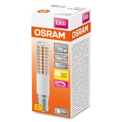 La Osram Special T Slim LED B15d Chiara 9W 1055lm - 827 Bianco Molto Caldo | Dimmerabile - Sostitutiva 75W è la sostituzione perfetta per la tua lampada convenzionale 75W B15d. Sostituire con il LED ti offrirà molti vantaggi.
