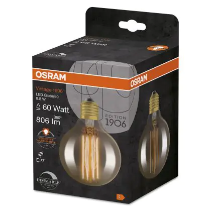 La Osram Vintage 1906 LED E27 Globe Filament Gold 80mm 8.8W 806lm - 822 Extra Warm White | Dimmable è la perfetta sostituzione per la tua lampada convenzionale 60W con attacco E27 grazie alla sua tecnologia LED. Passare a LED ti offrirà tanti vantaggi!