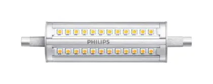 Questa lampadina a terminazione doppia lunga 118mm sostituisce le lampade alogene da 100W con un consumo di soli 14W a parità di resa luminosa.