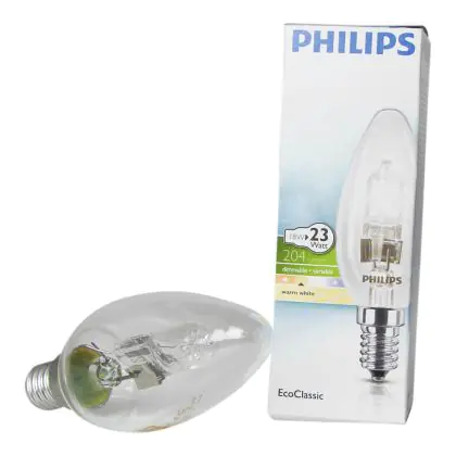 Le lampadine alogene Philips EcoClassic 18W E14 230V B35 CL sono dei modelli ad avvio istantaneo che offrono una luce brillante di ottima qualità in grado di rendere il vostro ambiente veramente vivace. Questa lampadina offre la possibilità di regolare l'intensità della luce profusa e presenta una vita utile doppia rispetto alle lampadine alogene normali. Questa lampadina ha una resa dei colori perfetta, pari a 100Ra; questa peculiarità, unita al design raffinato, rende la Philips EcoClassic 18W E14 230V B35 CL perfetta per applicazioni all'interno di negozi.
