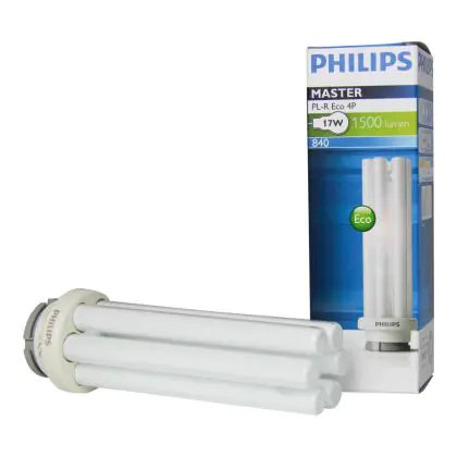 Le Philips PL-R Eco 17W 830 4P (MASTER) sono lampade fluorescenti compatte veramente efficienti dal punto di vista energetico in quanto consumano poca energia e sono caratterizzate da una vita media incredibilmente lunga. La base di queste lampade fluorescenti a basso consumo é del tipo GR14q-1 a 4 pin (perni). La potenza delle medesime é pari a 17W.