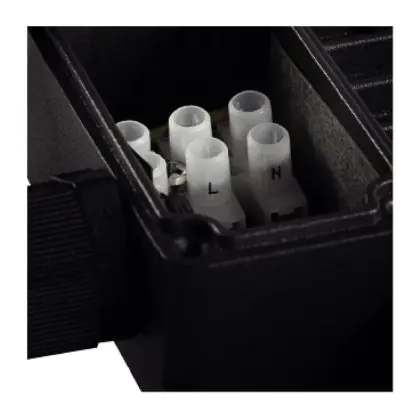 Questo apparecchio può essere usato sia in spazi interni che in spazi esterni, poiché ha indice di protezione contro l'ingresso di acqua e polvere IP65. In generale, un apparecchio con IP44 è resistente a schizzi di acqua e umidità, e può quindi essere installato in spazi esterni molto umidi o esterni riparati, come sono una tettoia. Un apparecchio che invece verrà esposto a intensi getti di acqua deve avere almeno IP54. Questa lampada ha anche un indice di resistenza a urti e impatti di IK06 - 1 Joule.