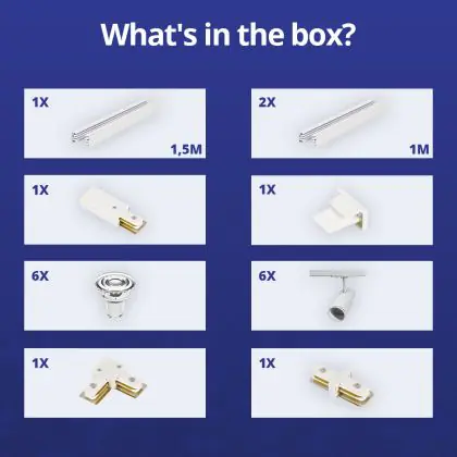 | Nome del fabbricante | Complete L shaped 1-Phase Track Set White incl. 6x Spot fixture + GU10 2700K 3W Dim – 1.5 x 2 meters | |