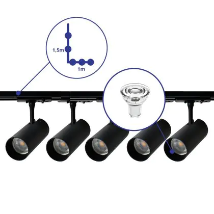 Descrizione Set completo 1-Fase Rail L 1 x 1,5 Metro Nero | incl. 5x Faretti + GU10 2700K 3W Dimmerabile + Tappo Di Chiusura, Connettore di Alimentazione e L -Connettore