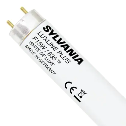 I Sylvania Luxline Plus T8 15W - 835 Luce Calda | 44cm sono i tubi più comuni e tra le lampade più vendute nel mondo. Questi tubi T8 (TL-D per Philips) hanno una lunghezza la quale corrisponde alla potenza di 15W.